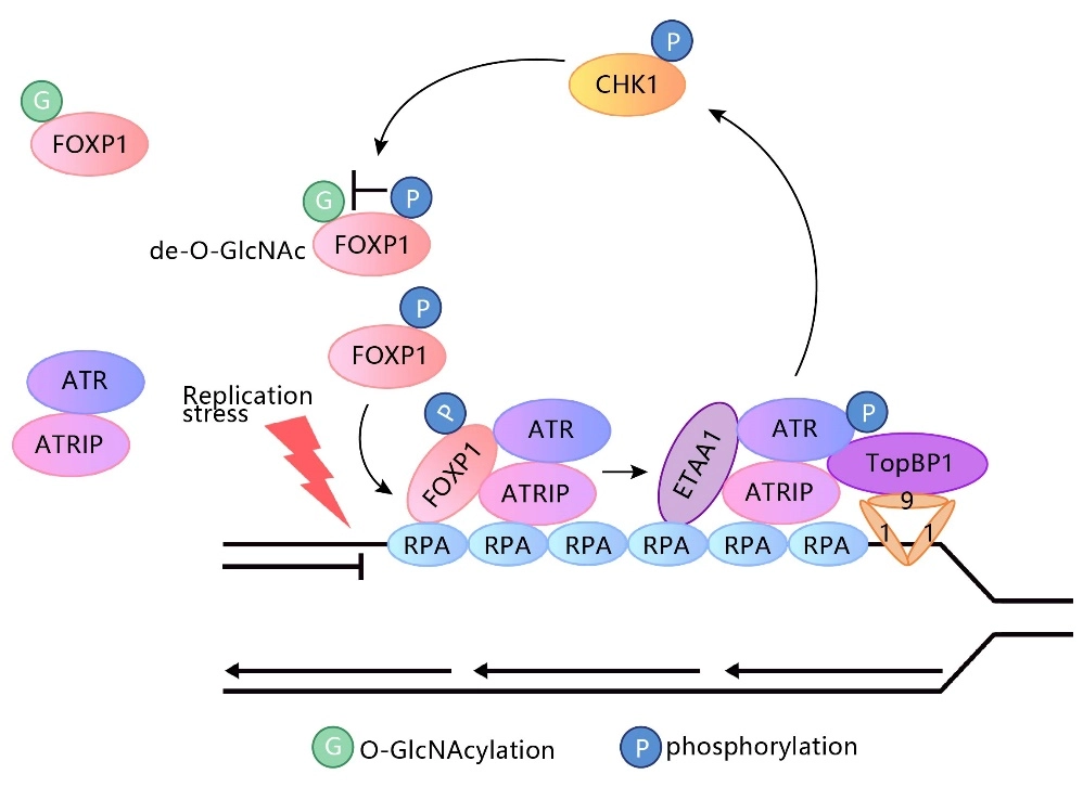 FOXP1 phosphorylation antagonizes its O-GlcNAcylation in regulating ATR activation in response to replication stress