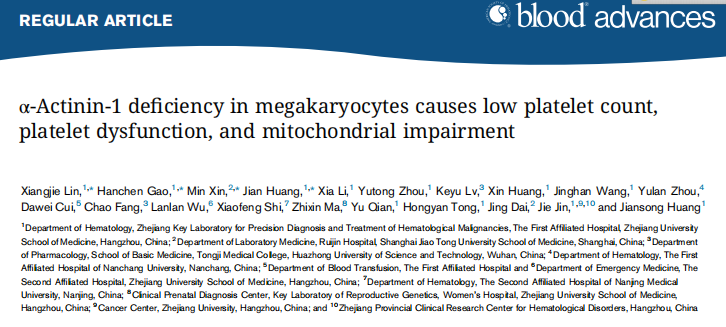 Lin X, Gao H, Xin M, Huang J, Li X, Zhou Y, Lv K, Huang X, Wang J, Zhou Y, Cui D, Fang C, Wu L, Shi X, Ma Z, Qian Y, Tong H, Dai J, Jin J, Huang J. α-Actinin-1 deficiency in megakaryocytes causes low platelet count, platelet dysfunction, and mitochondrial impairment. Blood Adv. 2025 Mar 11;9(5):1185-1201. doi: 10.1182/bloodadvances.2024014805. PMID: 39813624; PMCID: PMC11925533.
