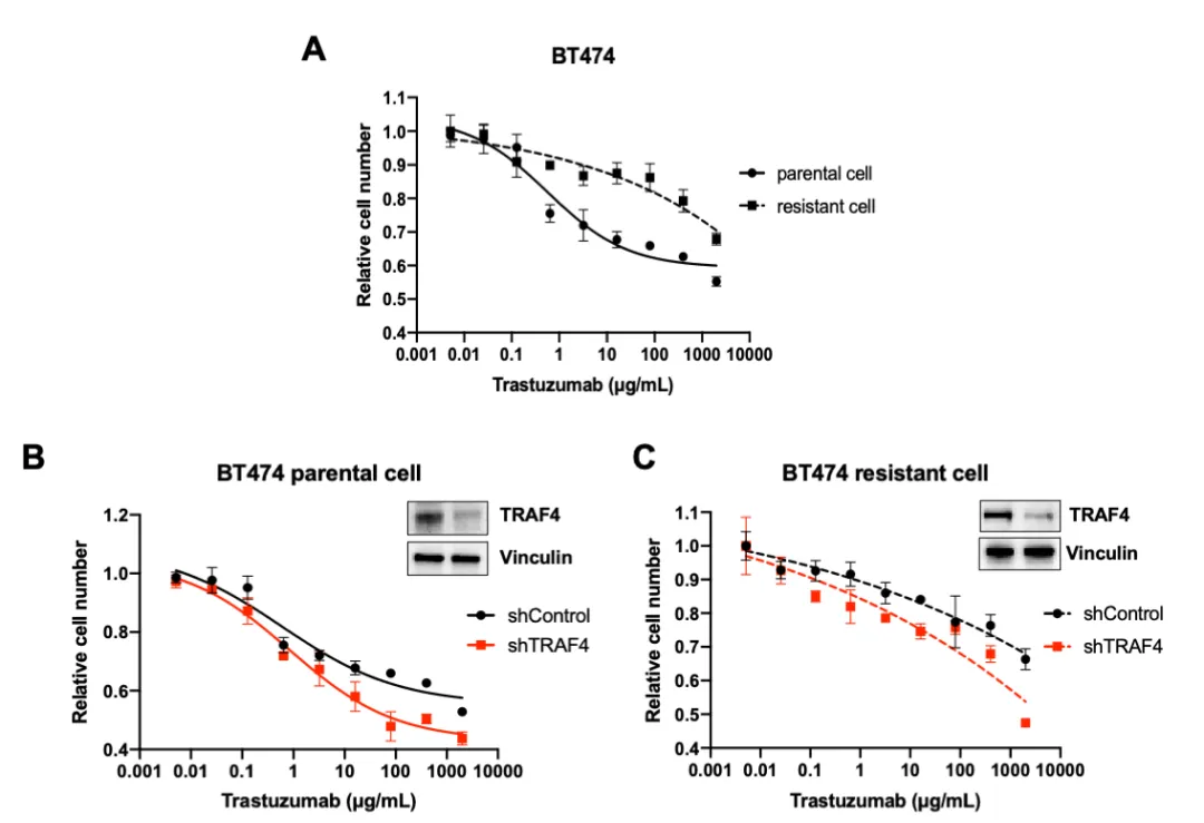 Figure 4: TRAF4 knockdown improves sensitivity to trastuzumab in both parental and resistant BT474 cells.