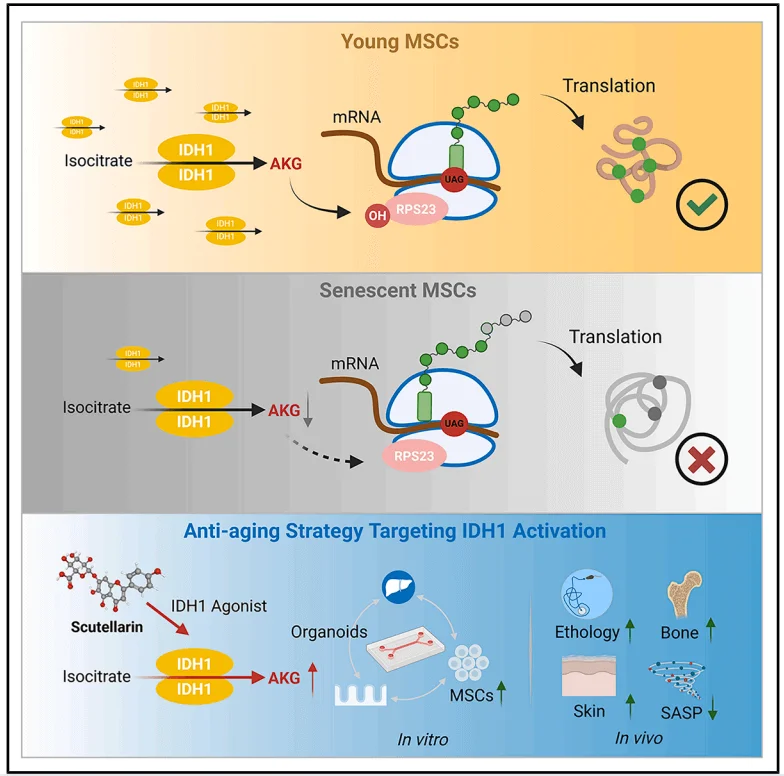 Stem cell senescence is recognized as both a hallmark and a driving force of organismal aging. Thus, exploring strategies to increase stem cell abundance as a means of delaying aging has become an active area of research. Loss of protein homeostasis is frequently observed during aging. Mechanistic defects or mutations can compromise translational fidelity, resulting in aberrant protein folding. This, in turn, leads to the production of dysfunctional proteins and the accumulation of harmful protein aggregates. Therefore, identifying anti-aging molecules or molecular combinations that can simultaneously enhance protein synthesis rates and improve translational accuracy represents a promising approach to counteracting stem cell senescence. In this study, the authors aimed to investigate the potential role and molecular mechanisms of IDH1 and AKG in regulating protein homeostasis during mesenchymal stem cell (MSC) senescence.