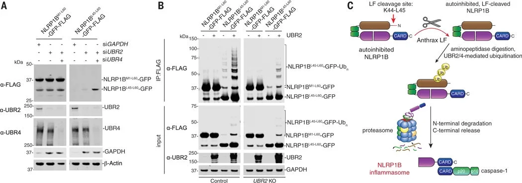 Subsequently, researchers generated single- or double-gene knockout RAW 264.7 cells for UBR2, UBR4, and UBA6. They found that these knockout cells exhibited high resistance to LT, although some LT-induced cell death was still observed after 3 hours due to genetic redundancy. In contrast, no cell death or NLRP1B degradation was induced in Ubr2/4 double-knockout RAW 264.7 cells, indicating that LT induces cell death via the N-end rule proteasomal degradation pathway. This finding provides new insights into the mechanism of NLRP1B activation..