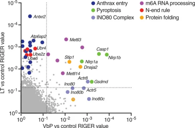 Application Case 2[3]: Intracellular pathogens and danger signals trigger inflammasome formation, which activates inflammatory caspases and induces pyroptosis. Both anthrax lethal toxin metalloprotease (LT) and DPP8/9 inhibitors can activate the NLRP1B inflammasome, but the molecular mechanisms underlying NLRP1B activation remain unclear. To investigate the mechanisms of NLRP1B activation, researchers conducted two genome-wide CRISPR-Cas9 screens in RAW 264.7 cells to identify genes whose knockout confers resistance to the DPP8/9 inhibitor Val-boroPro (VbP) or LT. The results showed that genes involved in the N-end rule proteasomal degradation pathway, including Ubr2, Ubr4, Uba6, Ube2z, and Kcmf1, were highly enriched by LT but not by VbP.