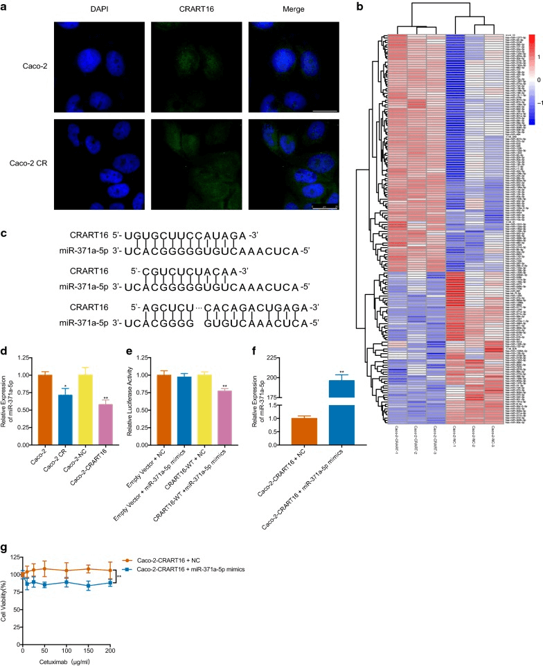 Long non-coding RNAs (lncRNAs) have been shown to be involved in various biological processes and confer resistance. However, it is still unclear whether lncRNAs are involved in the resistance effect of cetuximab in colorectal cancer cells. Researchers utilized Caco-2 cells to establish cetuximab-resistant cells (Caco-2 CR). It was found that lncRNA CRART16 was upregulated in Caco-2 CR cells, and then researchers constructed the Caco-2 cells with stable expression of CRART16 using the lentivirus method.The overexpression of CRART16 reversed the impact of cetuximab on cell viability and reduced cetuximab-induced cell apoptosis. Additionally, the overexpression of CRART16 resulted in an increase in the proportion of CD44+/CD133+ cells. Furthermore, CRART16 acts as a competitive endogenous RNA (ceRNA) for miR-371a-5p, which can regulate the expression of ERBB3. The miR-371a-5p mimic counteracted the cetuximab resistance induced by CRART16 overexpression. KEGG analysis indicated that the differentially expressed mRNAs generated upon CRART16 overexpression were primarily enriched in the MAPK signaling pathway[5].