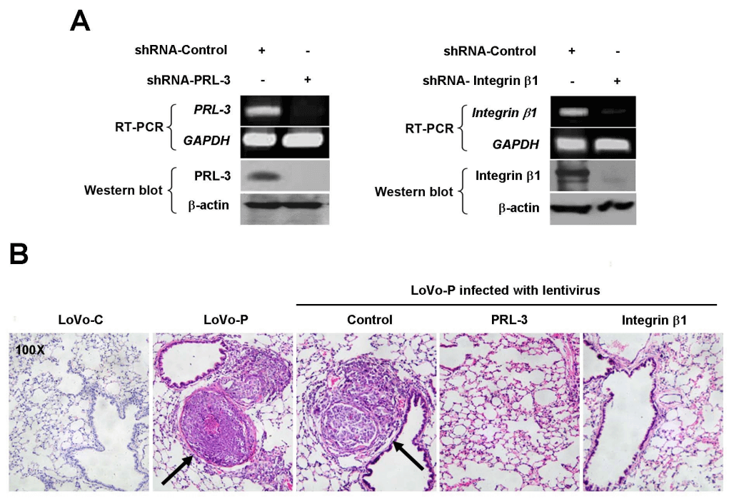 PRL-3 plays a pathogenic role in tumor metastasis, but its underlying mechanisms are not yet fully understood. Initially, it was discovered that PRL-3 is upregulated in liver metastatic foci of colorectal cancer, while showing low or no expression in normal colorectal epithelium, adenomas, and primary lesions. Based on observations from previous studies indicating that PRL-3 can decrease the tyrosine phosphorylation of integrin β1 in HEK293 cells and enhance the activation of ERK1/2, researchers explored the association between PRL-3 and integrin β1 signaling, as well as its functional significance in the movement, invasion, and metastasis of colon cancer cells LoVo. By constructing LoVo cells stably expressing PRL-3 (LoVo-P), the enhanced phosphorylation of ERK1/2 was validated. Furthermore, transient transduction of integrin β1 siRNA in vitro revealed that integrin β1 is essential for PRL-3-induced cell movement and invasion. Additionally, shRNA-integrin β1 and shRNA-PRL-3 interference cell lines were constructed to study the requirement of integrin β1 for PRL-3-mediated metastasis in nude BALB/c mice. It was found that integrin β1 not only inhibits PRL-3-induced ERK1/2 phosphorylation but also reduces PRL-3-mediated cell movement, invasion, and lung metastasis in nude mice. Downstream of the integrin β1 pathway, ERK1/2 phosphorylation and MMP2 activity were identified as the reasons for PRL-3-mediated cell invasion. In summary, the study indicates that the integrin β1-ERK1/2-MMP2 signaling pathway plays a critical role in PRL-3-promoted movement, invasion, and metastasis of colorectal cancer cells[6].