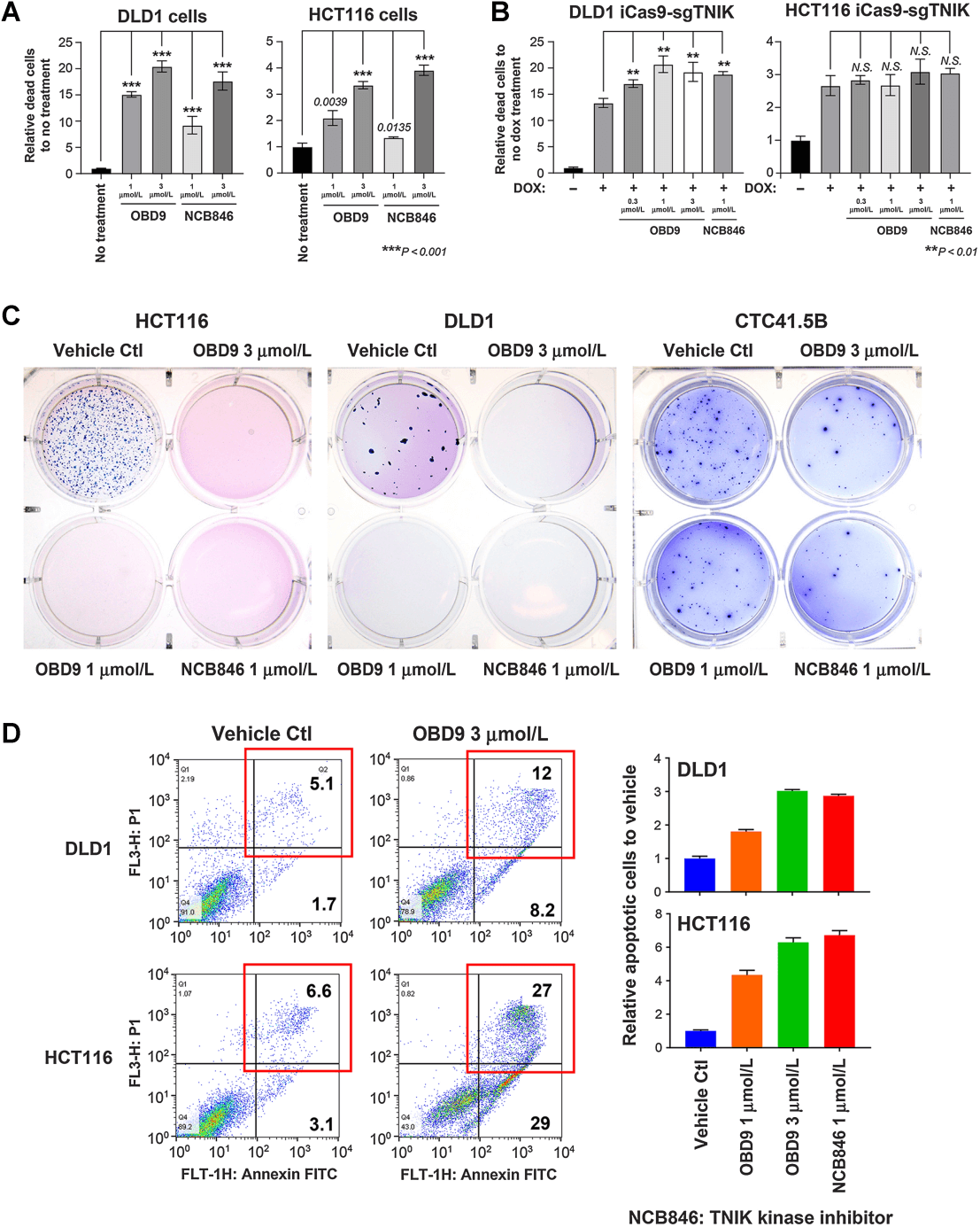 Due to a lack of efficacy or safety concerns with various Wnt signaling inhibitors, the clinical success rate is limited, driving people to find new targets in the Wnt signaling pathway. Researchers found that OBD9 has broad anti-cancer activity, particularly as an effective oral drug against colorectal cancer cells. To determine the mechanism, the researchers used HCT 116 and DLD-1 cells dealing with the drug and found that OBD9 exhibited cell viability-inhibiting activity similar to that of the potent TNIK kinase inhibitor NCB846. To investigate whether the inhibitory effect of OBD9 on cell viability might be due to TNIK suppression, researchers constructed TNIK inducible knockout cells (HCT116 iCas9–sgTNIK and DLD-1 iCas9-sgTNIK) and observed a decrease in cell viability following TNIK knockout. Additionally, HCT116 xenograft models were used to further confirm the inhibitory effect of OBD9 on the growth of colorectal cancer cells in vivo. The results indicated that this inhibitory effect is partly due to the autophagic mechanism in colorectal cancer cells promoting the degradation of TNIK, representing a new anti-tumor approach[3].