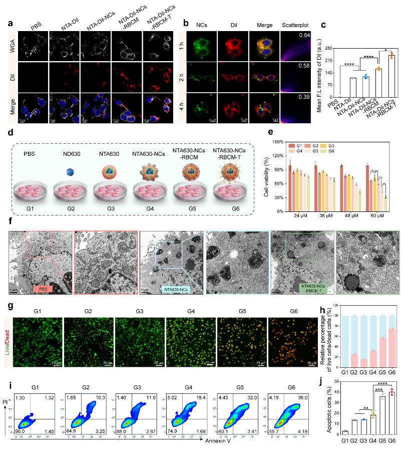 To further verify the therapeutic effect of NTA630-NCs-RBCM-T NPs on tumors, a mouse tumor model was first established. The tumor-targeting effect of NTA630-NCs-RBCM-T NPs was studied using in vivo fluorescence imaging of animals. Then, the in vivo anti-tumor effect of NTA630-NCs-RBCM-T NPs was evaluated by observing and recording the body weight, tumor size, and survival time of the mice, as well as the results of Ki-67 and TUNEL staining of the tumors. The results showed that NTA630-NCs-RBCM-T NPs could specifically target tumor lesions and had a long in vivo circulation time (Figure 3).