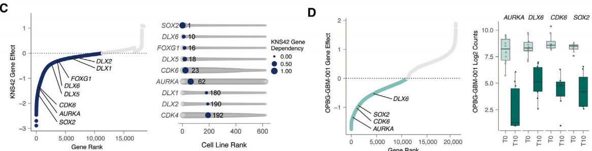 Figure 2: Gene ranking from KNS42 screening (C); Gene ranking from OPBG-GBM-001 screening (D).