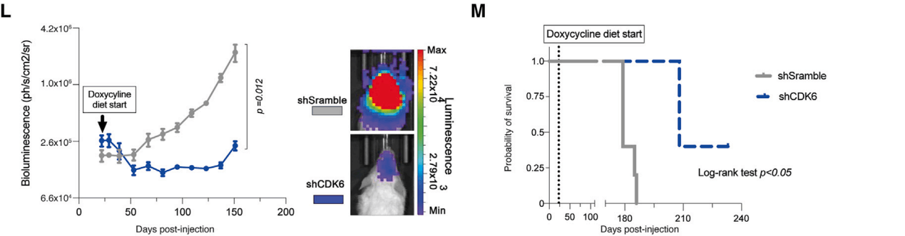 The depletion of CDK6 was validated in vivo through two methods. After the knockout of CDK6, BT690-DHG-H3G34 tumor cells were xenotransplanted into mice; following the formation of tumors from the BT690 xenografts, shRNA-mediated CDK6 knockdown was induced. Both methods significantly inhibited tumor growth and enhanced overall survival.