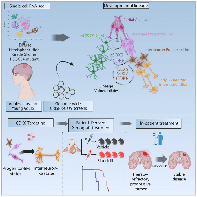 This study reveals that DHG-H3G34 recapitulates various stages of intermediate neuronal lineage development along a presumed developmental hierarchy and derives and validates unique targets from it. By integrating whole-genome CRISPR-Cas9 screening with single-cell RNA sequencing results, it demonstrates that DHG-H3G34 depends on genes from progenitor-like compartments in the intermediate neuronal lineage hierarchy, and targeting CDK6 can modify its characteristic developmental biology, paving the way for further translational research.