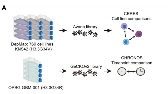Illon Liu et al. conducted whole-genome CRISPR-Cas9 screenings to identify genes critical for the growth and survival of DHG-H3G34 cells, ultimately discovering potential clinically actionable targets. To gain a deeper understanding of the gene dependencies and vulnerabilities of DHG-H3G34 tumor cells, the researchers performed two distinct whole-genome library screenings and data analysis.