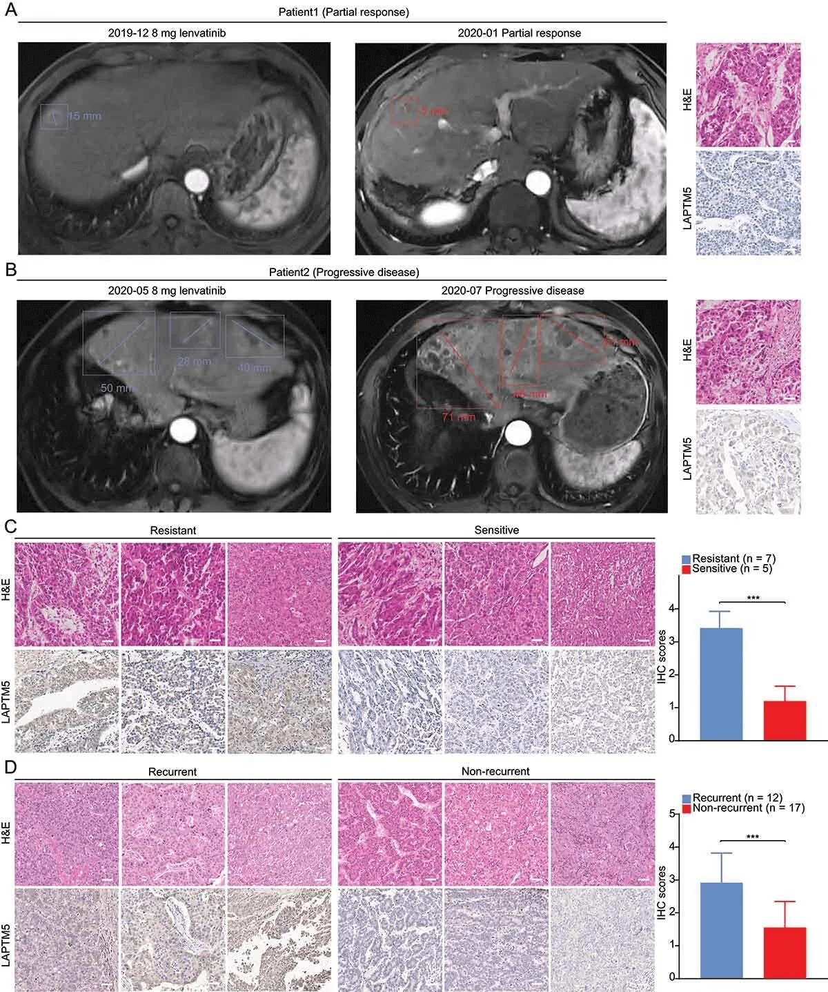 To further verify the clinical significance of LAPTM5, researchers then assessed the association between LAPTM5 and lenvatinib resistance by analyzing clinical samples. The researchers found that the level of LAPTM5 expressed in recurrent patients was significantly higher than in non-recurrent patients (1.87 times, P < 0.001). This observation indicates that LAPTM5 upregulation leads to lenvatinib resistance, as early recurrence after lenvatinib treatment may also be considered a sign of resistance. LAPTM5 may serve as a reliable biomarker for predicting patient response to lenvatinib, thereby providing precise guidance for clinical intervention.