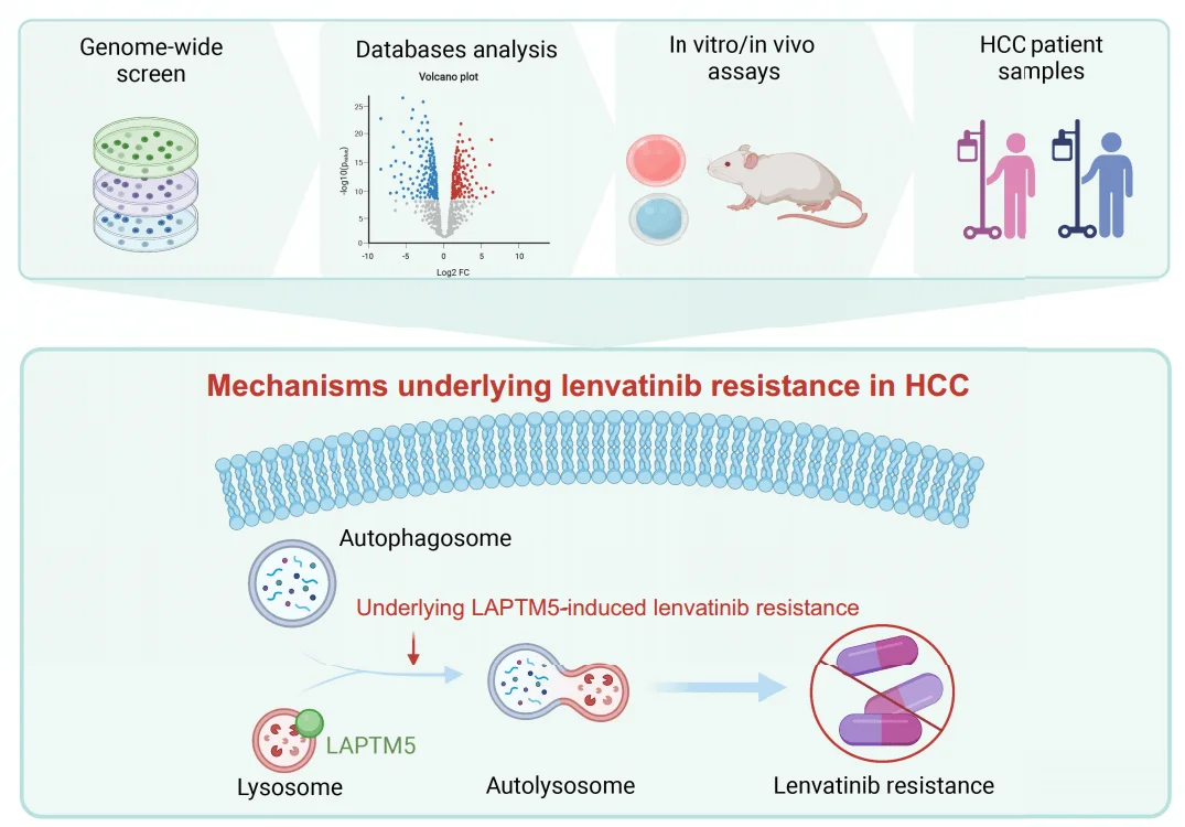 Autophagy is a cellular self-cleaning process that degrades damaged organelles and proteins to maintain cell health. In recent years, the role of autophagy in cancer has received increasing attention, especially in tumor drug resistance. Recently, a research published in Autophagy titled “Genome-Scale CRISPR screen identifies LAPTM5 driving lenvatinib resistance in hepatocellular carcinoma” used CRISPR library to perform a genome-wide screen in liver cancer cells, identifying a key autophagy-related gene: LAPTM5. Subsequently, HCC cell lines, patient-derived primary cell lines, human HCC xenografts, and immunocompetent mouse HCC models were used to verify that LAPTM5 mediates resistance to lenvatinib in liver cancer by regulating the autophagy process.