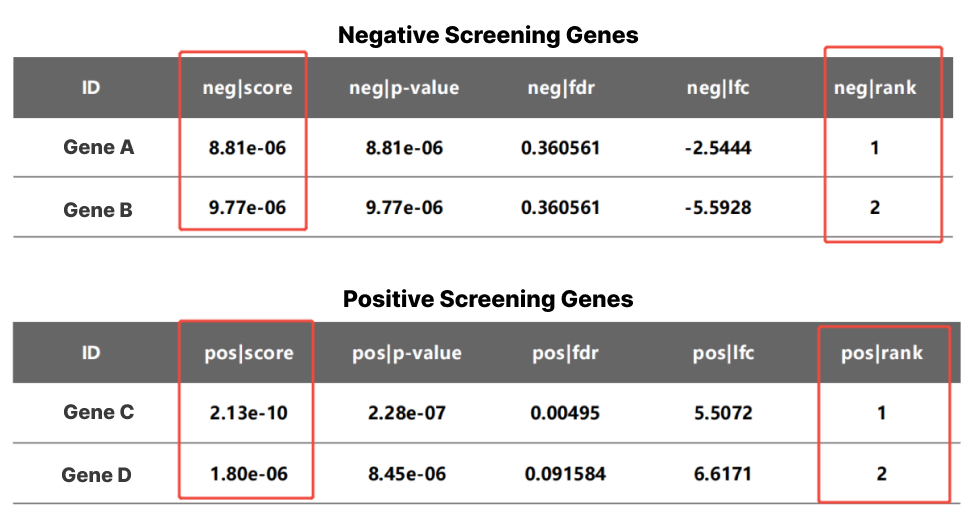 For CRISPR library screening results, the RRA (Robust Rank Aggregation) algorithm in the MAGeCK software [1,2] is typically used to analyze sgRNAs in the experimental and control groups to identify differential genes. As a comprehensive ranking algorithm, RRA scores and ranks each gene. The lower the RRA score, the higher the ranking, indicating a higher likelihood that the gene is a target gene. Additionally, in the bioinformatics analysis, both positive and negative screening results are analyzed. Positive screening results indicate that the gene is significantly enriched in the experimental group, while negative screening results indicate that the gene is significantly depleted in the experimental group.