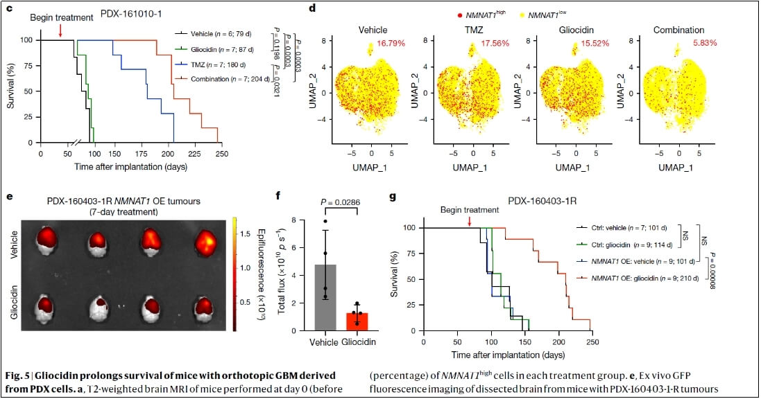 In the orthotopic GBM mouse model, combination therapy with Gliocidin and temozolomide significantly extended mouse survival compared to monotherapy with either Gliocidin or temozolomide (see Figure 5a, b). In patient-derived xenograft (PDX) GBM mouse models, combination therapy also prolonged survival, with single-cell RNA sequencing analysis indicating a reduction in tumor cell toxicity and improved survival.