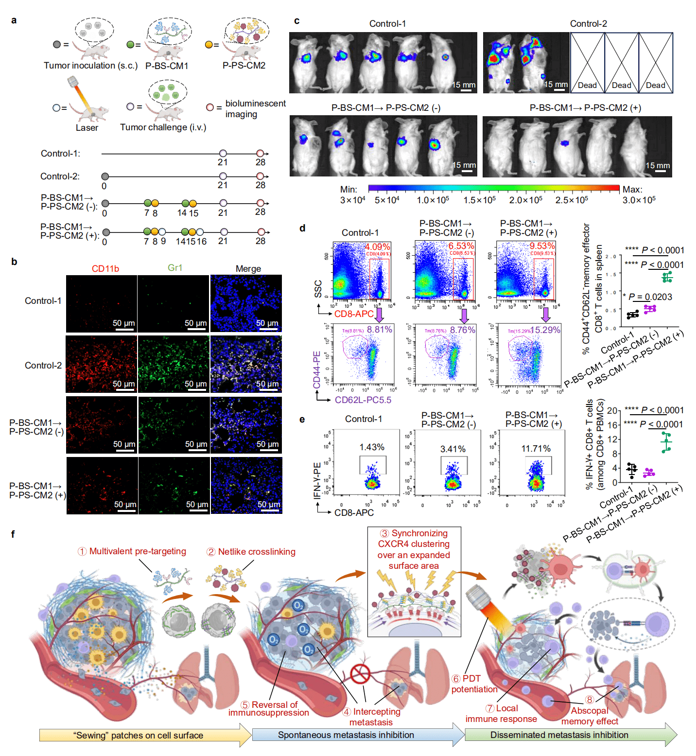 Furthermore, the authors found that different CXCR4 antagonistic modes had different intervention capabilities on downstream pro-metastatic pathways, with the receptor cross-linking antagonistic mode significantly outperforming multivalent ligands or free ligands. Cross-linking receptor clustering could effectively mediate tumor seed phenotype reshaping, seed-soil communication interception, PMN soil degradation, block key processes in the metastasis cascade, and confine cancer cells to the original tumor site. In addition, the authors covalently linked a photosensitizer to Nanothread-2 to achieve tumor-targeted photodynamic therapy in a “hitchhiking” manner, not only enhancing killing of the primary tumor but also significantly inducing immunogenic cell death and activating anti-tumor immune responses. Mice injected intravenously with the bioluminescent mouse breast cancer cells (4T1-Luc) provided by Ubigene were used to establish a model of disseminated tumor metastasis. Post-combined therapy, the mice resisted the growth and spread of disseminated tumor cells in vivo, and the effector memory T cells increased significantly. This indicates that the above strategy can simultaneously inhibit spontaneous metastatic tumors and disseminated metastatic tumors.