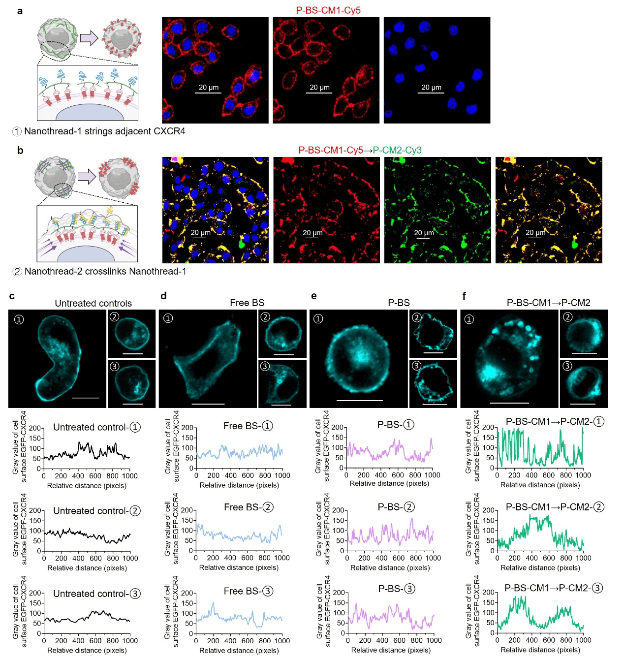 Nanothread-1 labeled with red fluorescence anchors uniformly on the cell surface after the first administration. Subsequently, Nanothread-2 labeled with green fluorescence was administered, and it was observed that the red fluorescence and green fluorescence highly overlapped, and their distribution on the cell surface underwent significant changes from a uniform circular pattern to a concentrated dot pattern. This indicates that the two polymers interact on the cell surface, leading to receptor redistribution. To further demonstrate receptor clustering, cells were transfected to express fluorescently labeled CXCR4. Compared to the untreated group, free ligand, and polymer-based multivalent ligand cross-linking strategy, the receptor had a stronger effect, significantly inducing receptor clustering and altering the spatial distribution of CXCR4 on the cell surface.