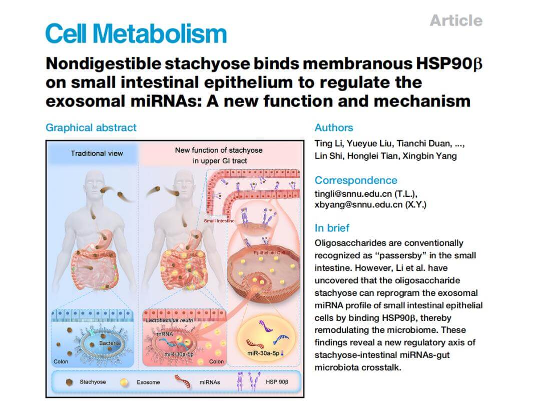 Li, Ting, et al. "Nondigestible stachyose binds membranous HSP90β on small intestinal epithelium to regulate the exosomal miRNAs: A new function and mechanism." Cell Metabolism (2024). https://doi.org/10.1016/j.cmet.2024.10.012