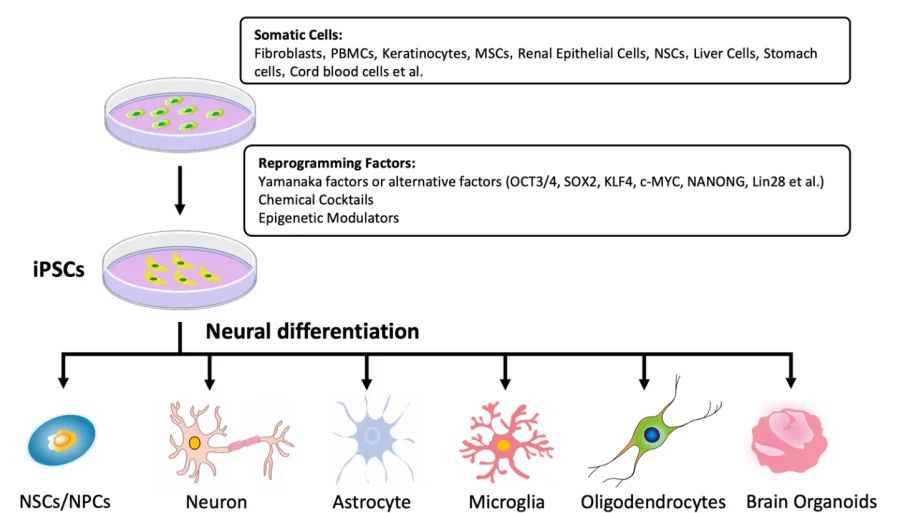 In numerous neurodegenerative diseases, the abnormal phenotypes of neurons, glial cells, and other neural lineage cells are closely related to the onset of the diseases. However, obtaining these cells has always posed tremendous challenges. The advent of hPSCs (human pluripotent stem cells) has significantly alleviated this problem. Due to their multi-directional differentiation potential and the continuous optimization of neural directed differentiation methods, various types of neural cells and organoids derived from hPSCs have been widely applied in the field of neuroscience. They particularly show great potential in establishing in vitro disease models, providing an ideal system and platform for studying the pathogenesis of neurodegenerative diseases and drug screening. Below, we have listed the main differentiation types and common differentiation methods for neural lineage cells and brain organoids based on hPSCs.