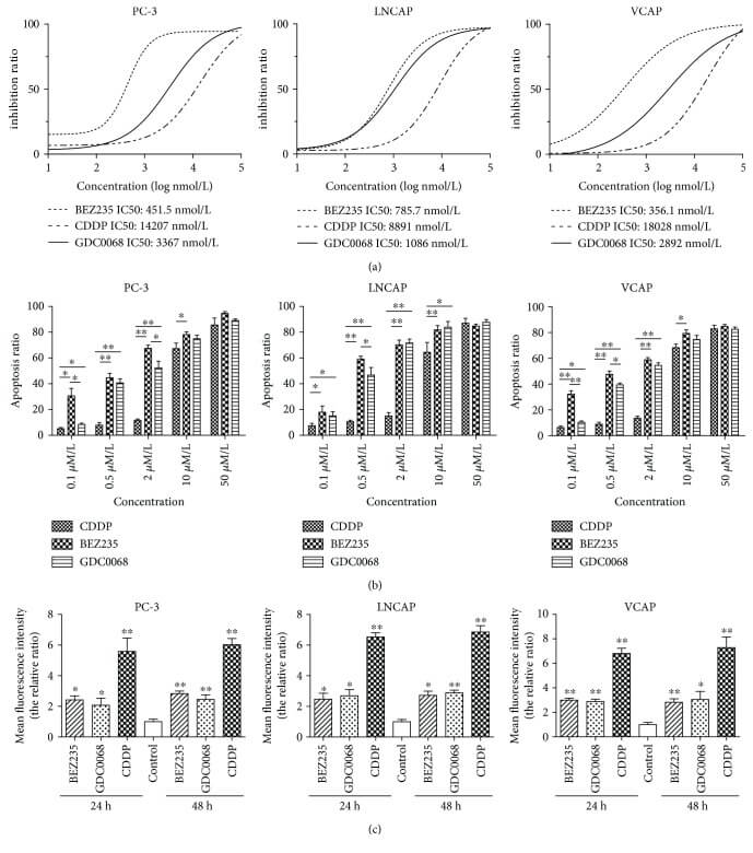 Figure 3: BEZ235 and GDC-0068 reduce proliferation and induce apoptosis in PC cells more effectively than that in CDDP.