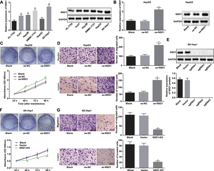 Figure 3. NSD1 knockout inhibits the proliferation, migration, and invasion capabilities of HCC cell lines.