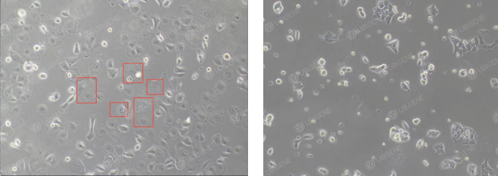 Poor Cell Growth Appearance: Cells exhibit abnormal morphology, such as enlarged and flattened cell bodies (as shown in the red box in the image below). Cells may become irregular in shape, lose their typical cobblestone-like appearance, and display vacuolization and other signs of distress.