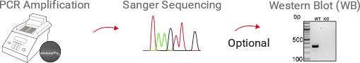 Ubigene performs genotypic validation of knockout (KO) cell lines using PCR amplification combined with Sanger sequencing to confirm successful gene disruption at the DNA level. For customers requiring additional verification, customized assays are available as supplementary services. These may include Western blotting or qPCR, depending on the target gene and specific experimental requirements.