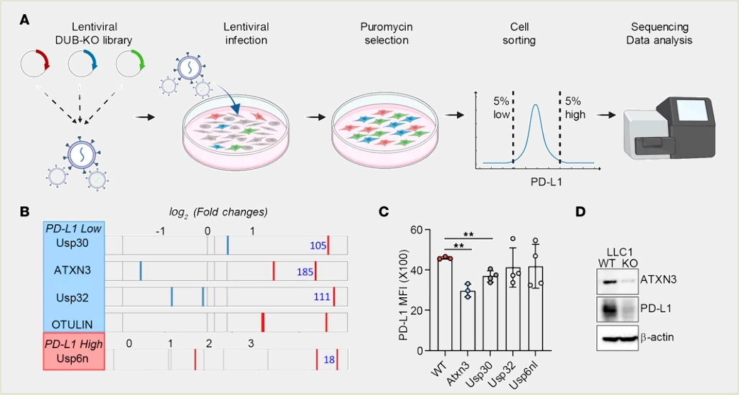 The authors constructed a CRISPR screening platform covering 96 members of the deubiquitylase family. By analyzing cell populations with low and high PD-L1 expression, they identified ATXN3 as a positive transcriptional regulator of PD-L1. Tumors lacking ATXN3 responded better to low-dose anti-PD-1 treatment, and inhibition of ATXN3 enhanced the efficacy of immune checkpoint blockade therapy.