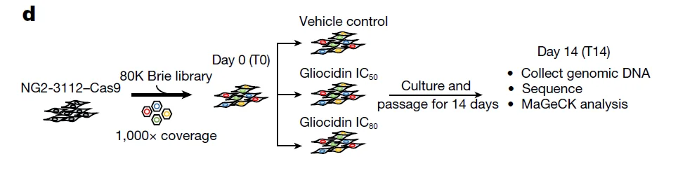 In this study, the authors employed a whole-genome mouse CRISPR knockout library (Brie) to perform CRISPR screening in NG2-3112 cells. Cells were treated with Gliocidin at different concentrations (IC50 and IC80) and harvested on Day 0 and Day 14 post-treatment. Results from positive and negative selection screens indicated that positive and negative regulators of mTORC1 respectively decreased and increased tumor cell sensitivity to Gliocidin, highlighting the critical role of the mTORC1 pathway in mediating the anti-glioblastoma efficacy of Gliocidin.