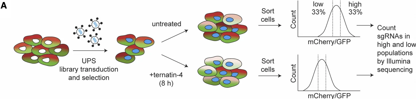 In this study, the authors generated a cell line overexpressing mCherry-eEF1A fusion protein and performed CRISPRi screening of UPS gene sets in this cell line. Based on previous findings that Ternatin-4 promotes eEF1A degradation, they treated the cells with Ternatin-4 and enriched the populations according to mCherry fluorescence intensity. This approach led to the identification of RNF14 and RNF25 as key mediators of eEF1A and ribosomal protein ubiquitination.