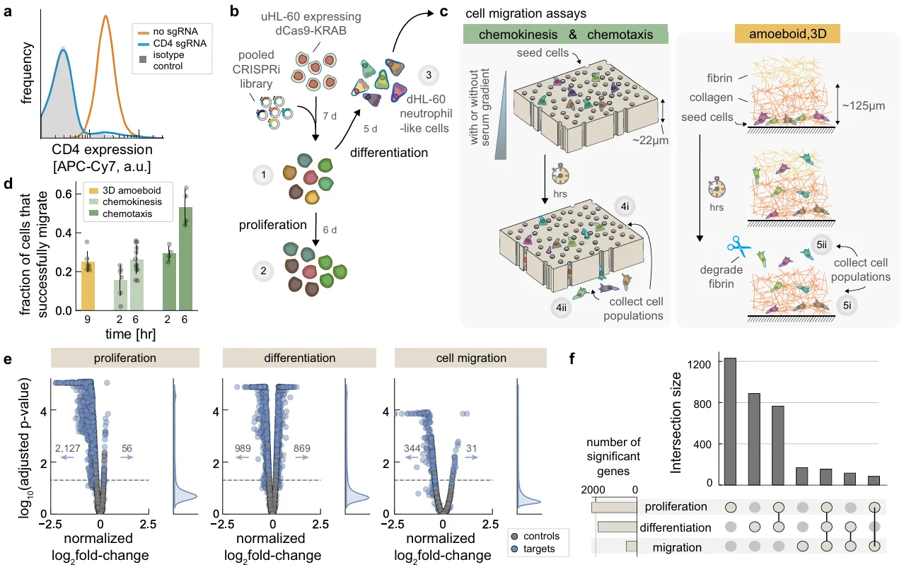 In this study, the authors used a whole-genome CRISPRi library and designed three experimental models to investigate key regulators associated with different migration behaviors of neutrophils. In two models, cells were seeded in a top reservoir above a track-etched membrane with 3 μm pores. A chemical gradient was established by adding 10% heat-inactivated fetal bovine serum to different regions of the reservoir to assess ordered and disordered chemotactic migration. In the third model, cells were embedded in a synthetic extracellular matrix to study amoeboid 3D migration, simulating movement through tissue interstices. Using these models, the authors identified 344 genes whose knockdown decreased the proportion of migrating cells and 31 genes whose knockdown increased migration. They also revealed the role of mTORC1 signaling in HL60 cell differentiation, affecting neutrophil abundance, survival, and migration behavior.
