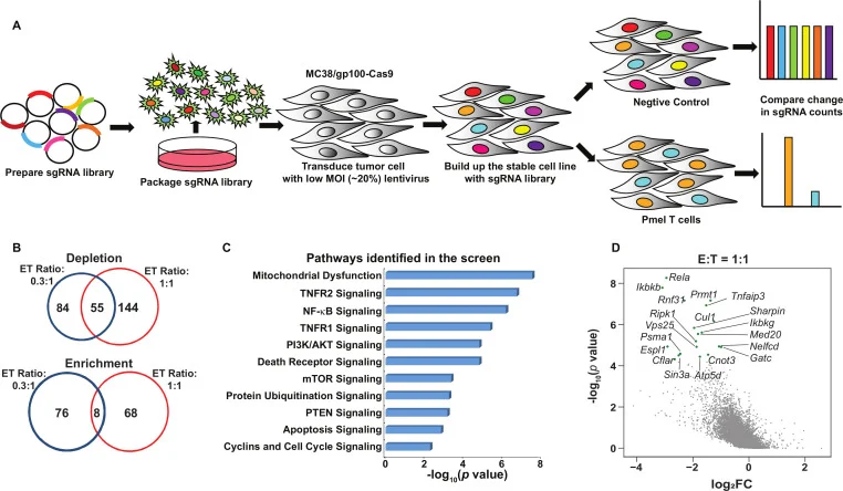 In this study, the authors applied a selective pressure system by co-culturing mouse colon cancer cells (MC38) with PmelT cells to identify unknown genes that play key regulatory roles in immunotherapy efficacy. During functional screening, for the T cell treatment group, PmelT cells were added at effector-to-target (E:T) ratios of 0.3:1 and 1:1 and cultured for 16 hours. For the non-T cell control group, an equivalent volume of T cell growth medium was added to assess in vitro sensitivity or resistance to T cell-mediated cytotoxicity. The study identified two distinct immune resistance regulators and demonstrated their potential as therapeutic targets to enhance immunotherapy efficacy. Among them, PRMT1 and RIPK1 were identified as a dual immune resistance regulator and a cytotoxicity resistance regulator, respectively. While the extent of effect varied among different types of immunotherapies, targeting PRMT1 and RIPK1 sensitized tumors to T cell-mediated killing and anti-PD-1/OX40 therapy.