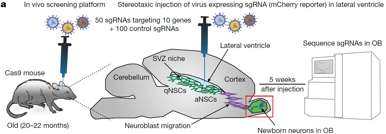 To validate the functional targets identified in vitro that promote NSC activation upon knockout, the authors developed an in vivo functional screening platform in aged mouse brains. Quiescent NSCs (qNSCs) in the subventricular zone naturally activate in vivo and generate progeny that migrate to the olfactory bulb and differentiate into newborn neurons. This regenerative niche provides an ideal model for in vivo screening. The authors injected sgRNA library viruses into the lateral ventricles of aged mice to infect subventricular zone NSCs. Five weeks post-infection, genomic DNA from the olfactory bulb tissue was sequenced to analyze sgRNA abundance. Due to the limited number of cells available for in vivo screening, this platform was used for efficient validation of selected functional targets that showed significant effects in the in vitro system.